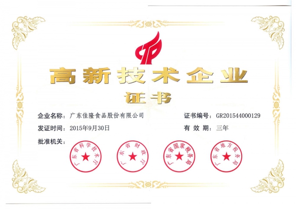 醇真雞粉系列::高新技術(shù)產(chǎn)品證書2015